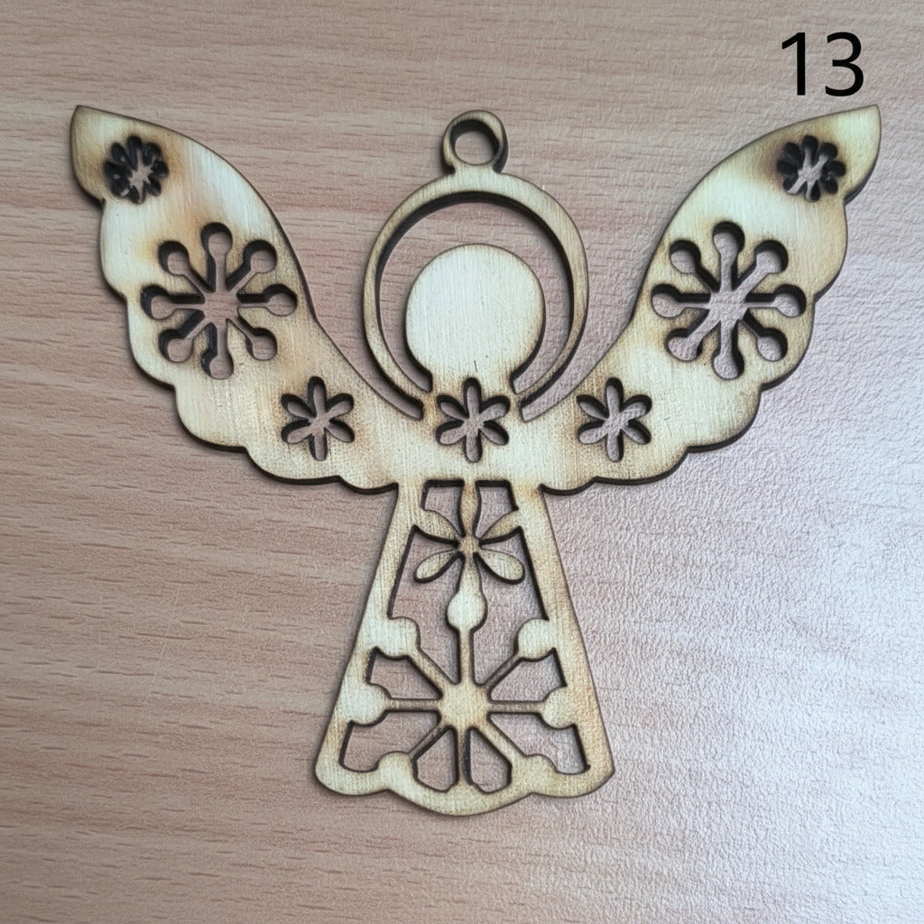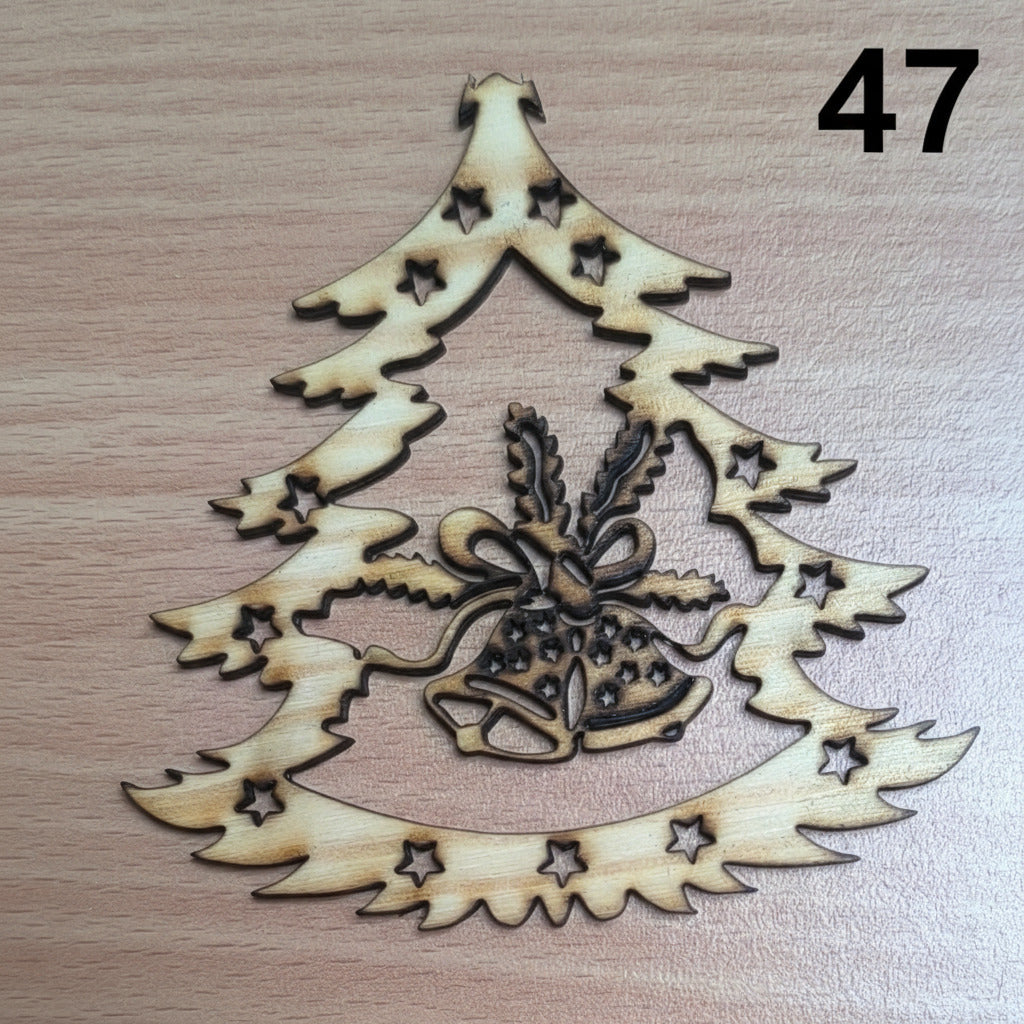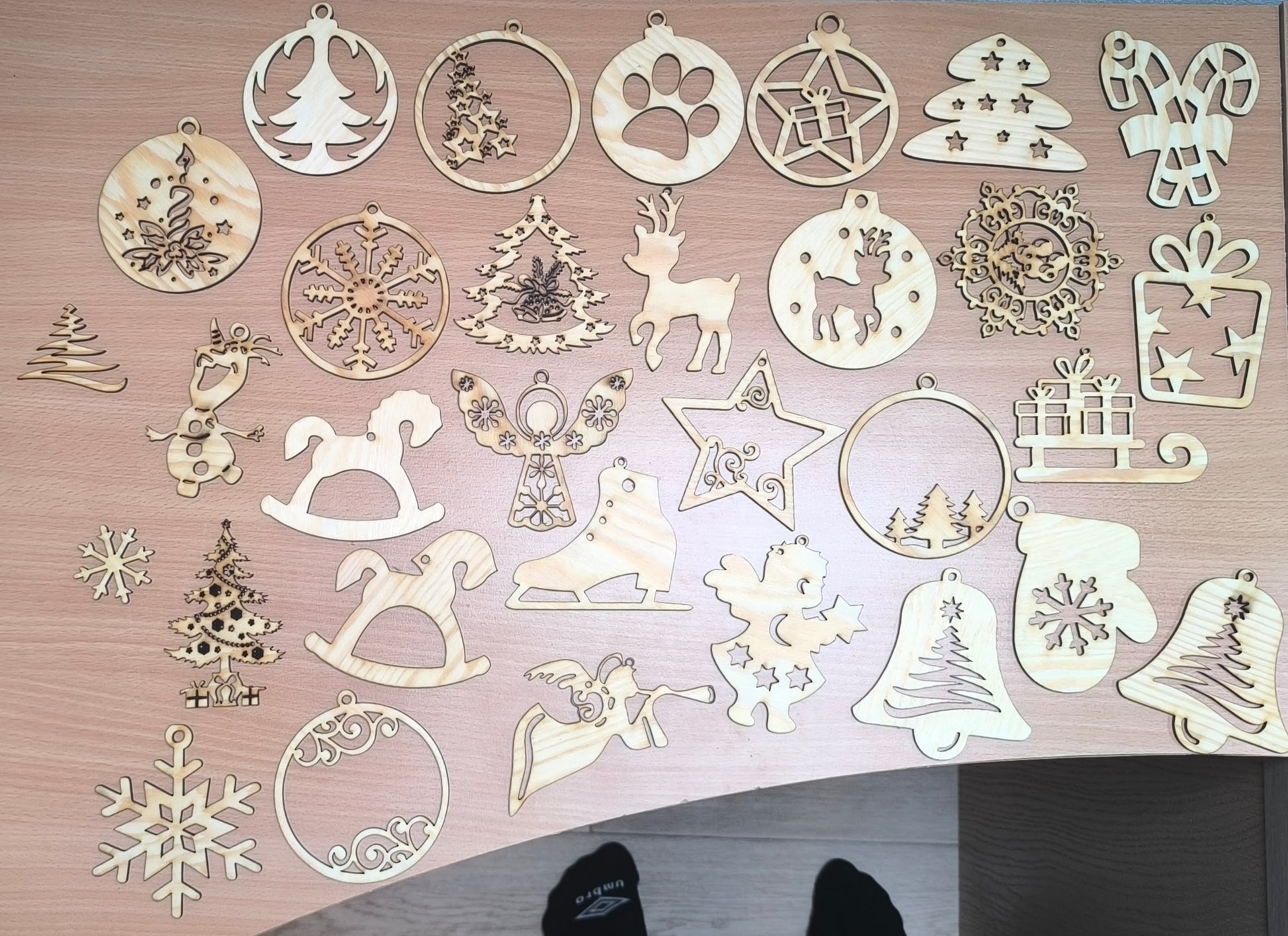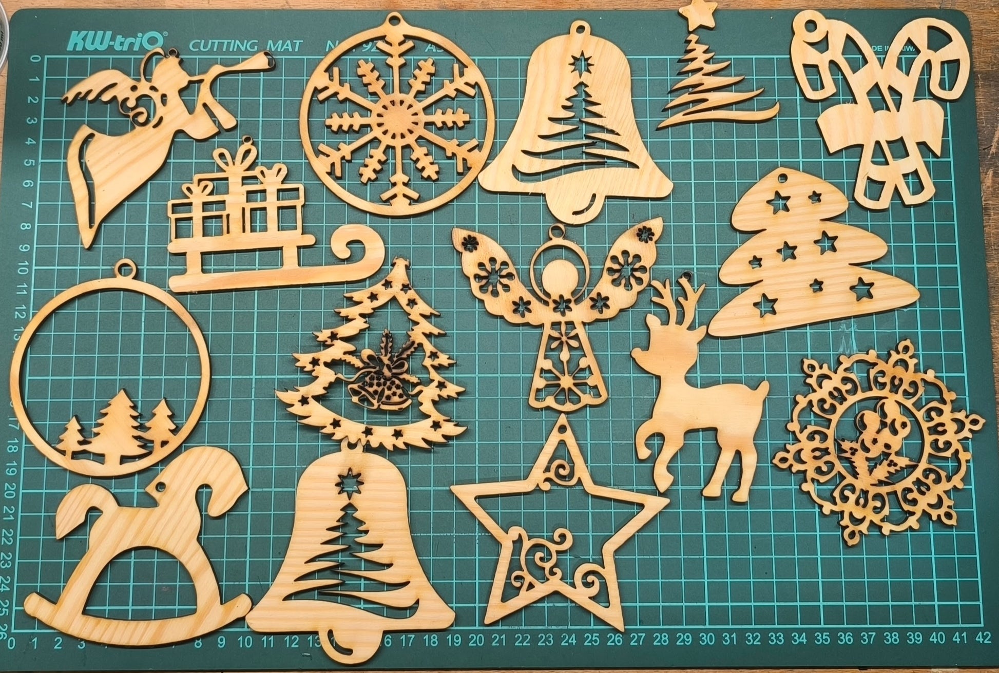 Vánoční ozdoby vyřezávané z dřevěné překližky.